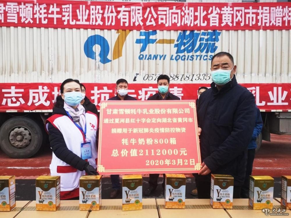 新华社客户端甘肃频道3月2日电(记者胡伟杰)2日,甘肃雪顿牦牛乳业股份有限公司通过甘南藏族自治州委统战部、州工商联向湖北省黄冈市捐赠800箱,价值212万元的雪顿全脂牦牛奶粉,用于帮助一线医护人员及重病患者增强抵抗力,助力疫情一线早日打赢疫情防控攻坚战。