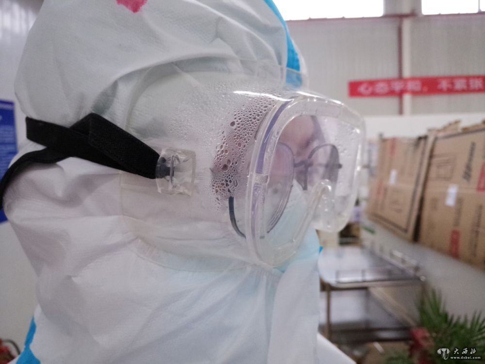 医护人员佩戴护目镜长期工作后,近视镜已经开始起雾。(受访者供图)
