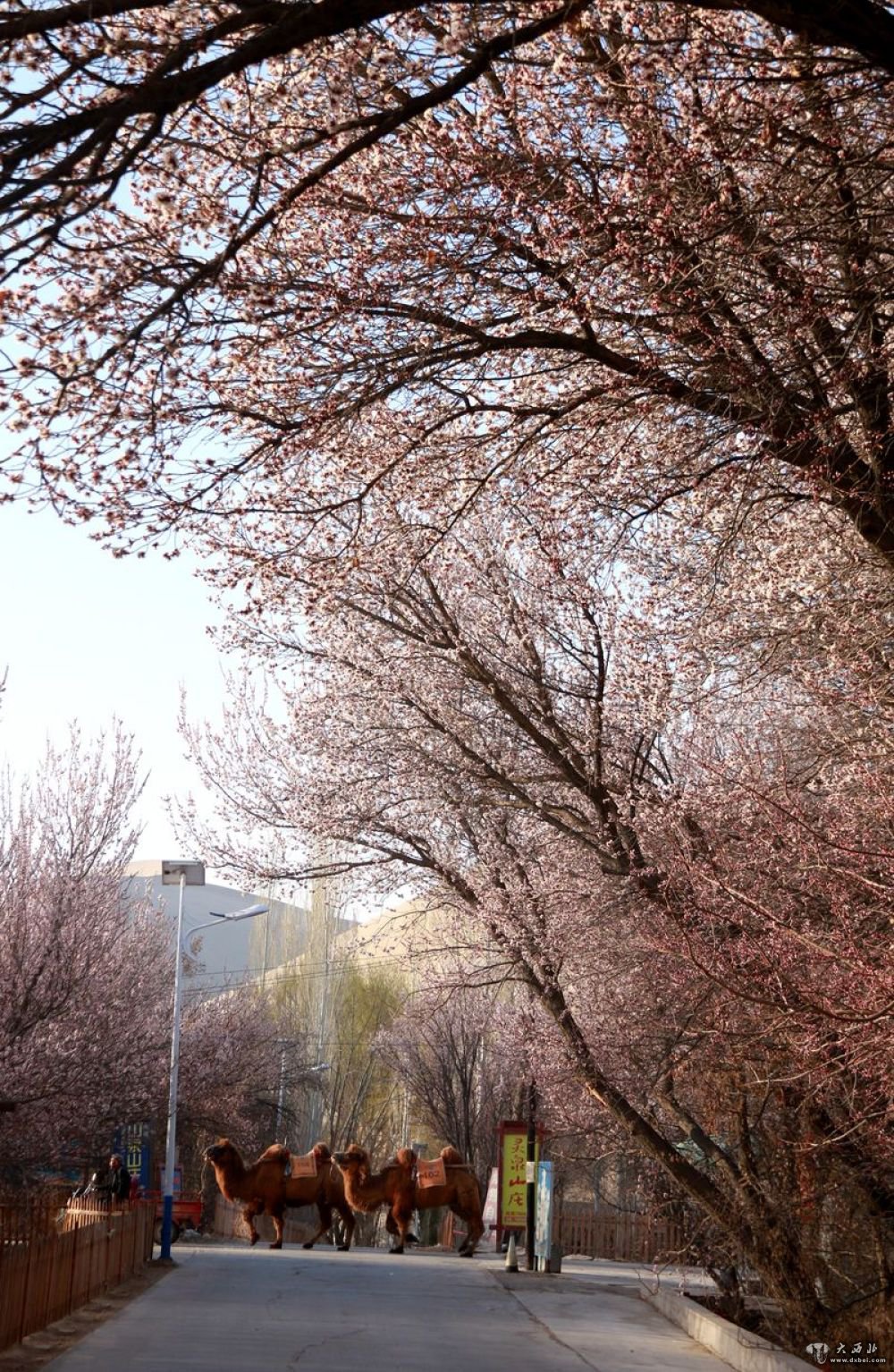 4月2日,月牙泉镇月牙泉村村民牵着骆驼行走在杏花下的乡间路上。新华社发(张晓亮摄)