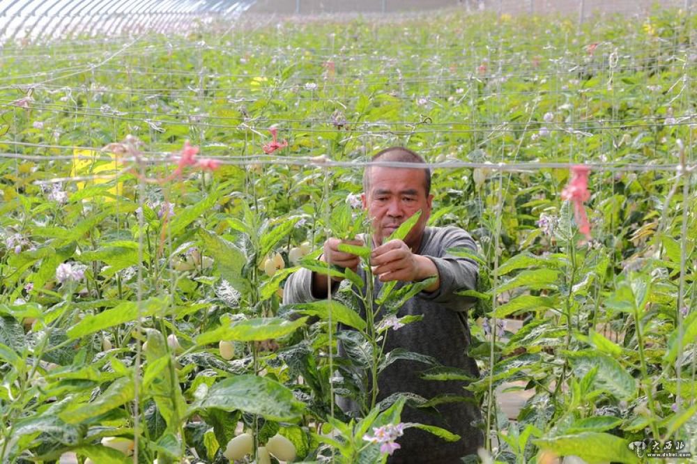 4月7日,在敦煌市郭家堡镇土塔村,村民在温室大棚给西瓜吊秧。新华社发(杜哲宇摄)