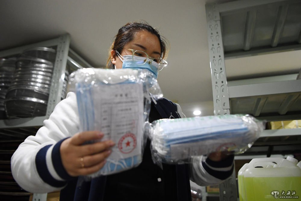 4月8日,兰州二中工作人员俞骁婷在库房内清点整理口罩。新华社记者陈斌摄