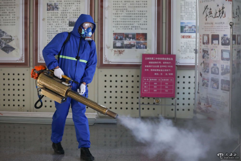 4月8日,兰州二中工作人员在校园内开展消杀工作。新华社发(马希平摄)