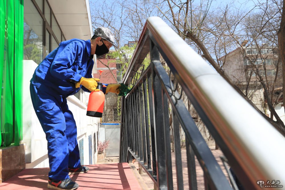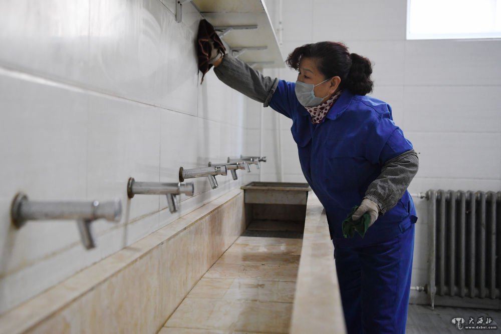 4月8日,兰州二中工作人员李玉萍擦拭水房墙面。新华社记者陈斌摄