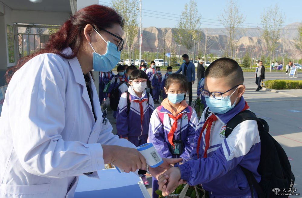 4月27日,在甘肃省临夏回族自治州永靖县移民小学,二年级学生在校门口测量体温。新华社发(史有东摄)
