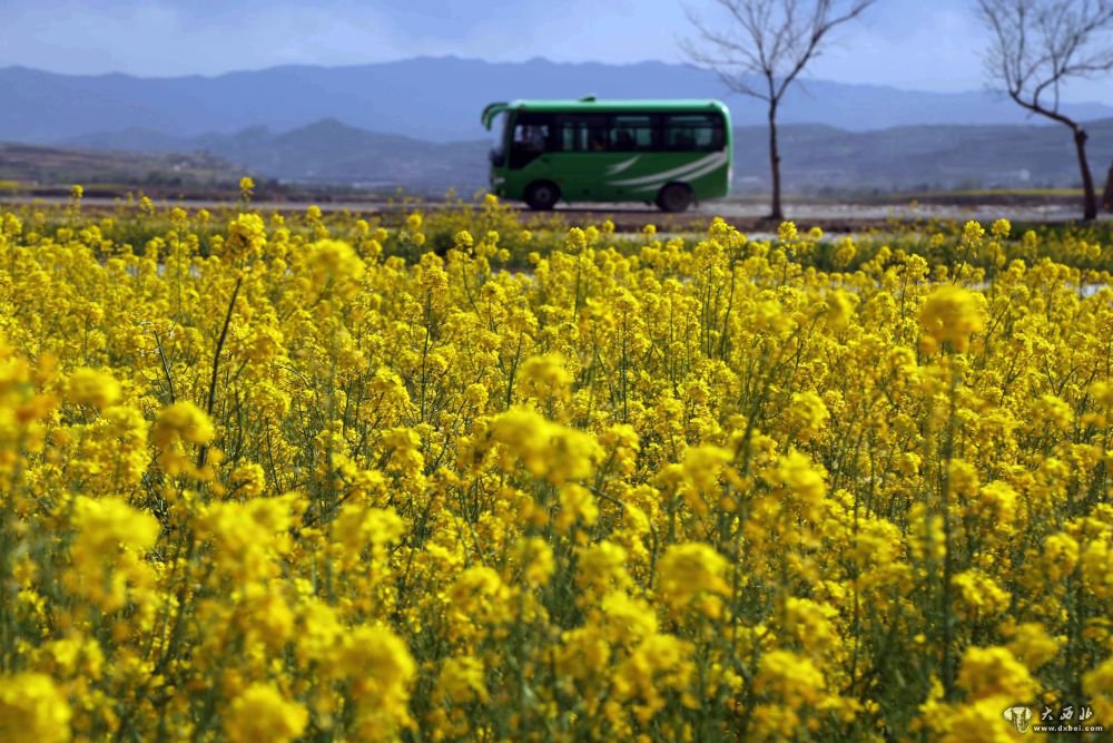4月28日,在甘肃省定西市陇西县云田镇,一辆汽车从油菜花田旁驶过。新华社发(王克贤摄)
