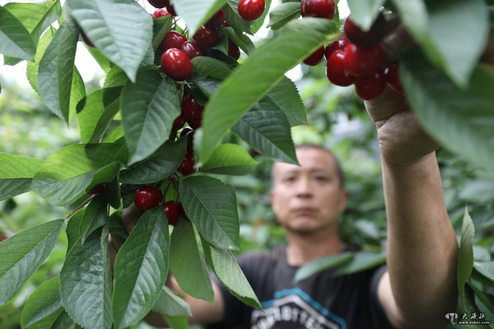 6月20日,天水市秦州区藉口镇村民赵利兵在果园里采摘樱桃。新华社记者多蕾摄