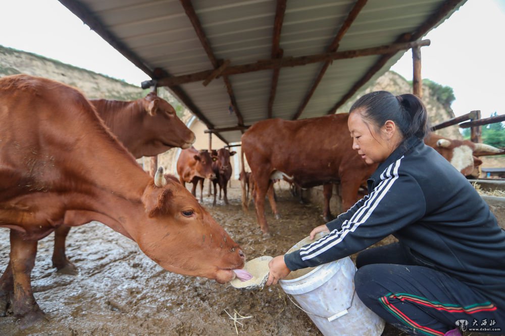 7月12日,在甘肃省崇信县锦屏镇的窑洞“托牛所”里,朱海萍在喂牛。新华社发(马希平摄)