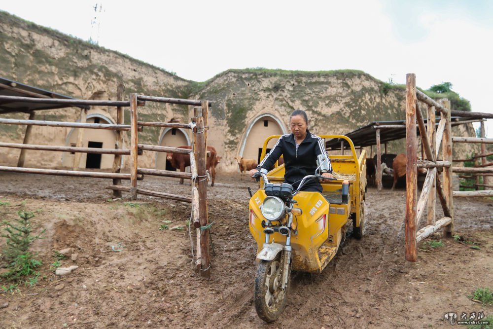 7月12日,在甘肃省崇信县锦屏镇的窑洞“托牛所”,朱海萍驾车去拉草料。新华社发(马希平摄)