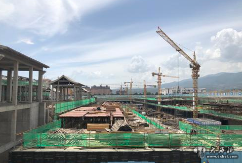 榆中县文化产业园(文成广场)建设项目施工现场,塔吊林立、一派繁忙,部分主体建筑物雏形可见,以中国古典建筑风格的构筑物耸立其中格外夺目。