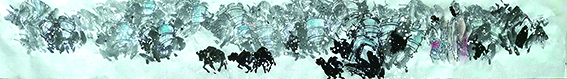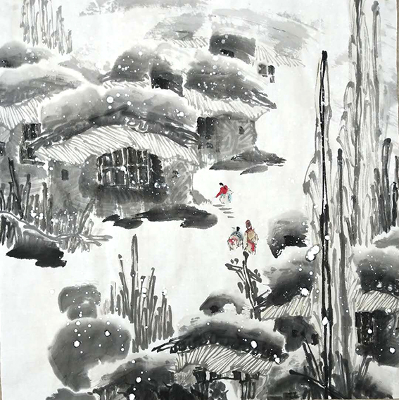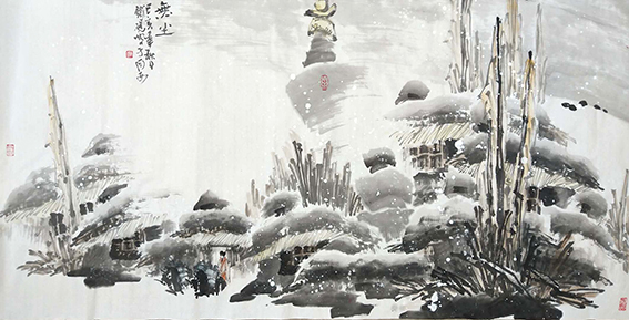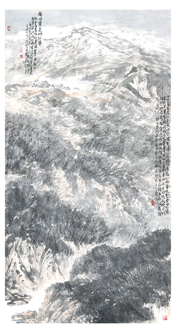 他笔下那些面目虚实凝重的物体,表情的丰富以至于不愿意敞开他(它)的脸面,情到深处不言情啊!画面的人物,正摇曳在光与影的游戏当中,演绎着世态万千、众生万相。在《又见雪山》中体现的更加完善,五只牦牛一只雏狗,似乎腰间挂着酒壶,此人面目相背、墨重而又模糊,“五色”组成的身形与依稀的动态,整个画面沉浸在一种无奈而尤为勇者的抗争气氛中。构图大胆、抛开世俗的牵绊,表现张扬与内敛衔接有度,情感隐藏与笔墨之内,墨宏气大。