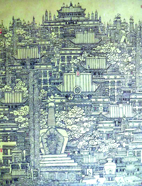 大漠、高原、老酒、雪山、白塔在意念中似乎总是飘来苦涩的风情,他用力赋予它生命和颜色,淡懒和褐霉、浓艳与涩寡、苍凉与幽情硬是在这种貌似轻描淡写的浅颦微叹之中表达一番。