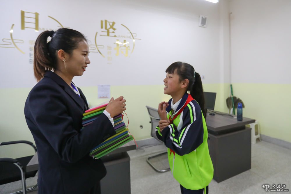 9月9日,在东乡族自治县实验小学教师办公室,唐梅兰(左)和学生交流。新华社记者马希平摄