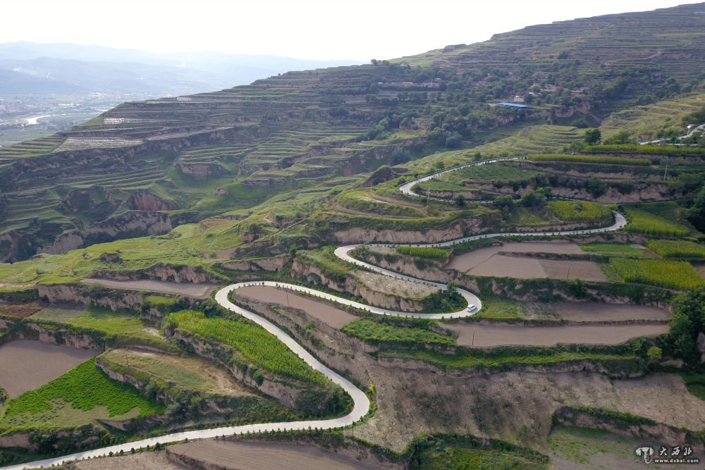 这是9月3日在甘肃省天水市秦安县陇城镇拍摄的盘旋行驶在山路上的陇城教育园区教师校车(无人机照片)。新华社记者范培珅摄
