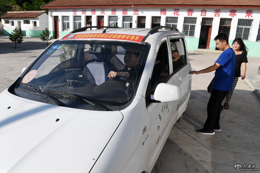 9月3日,在秦安县陇城教育园区赵山教学点,“走教”老师付耀峰(右二)、王昕(右一)准备乘坐教师校车返回园区公寓。新华社记者范培珅摄