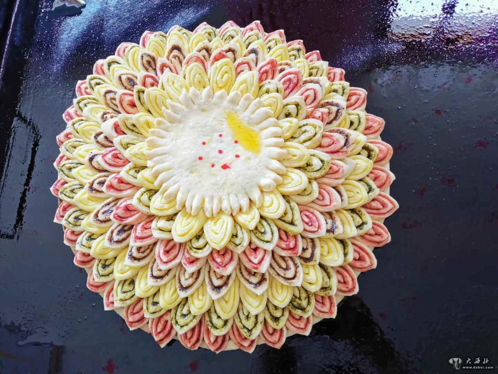 民勤月饼大,但是制作精美,用面点做成的“花瓣”层层叠叠,远看好似生日蛋糕。由于“体量”巨大,“月饼”一词被赋予新的含义:能吃一个月的烤饼。