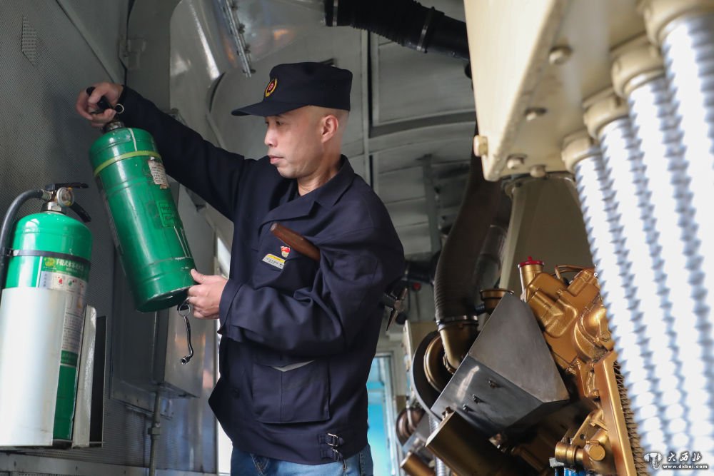 10月1日,曹亚民检查列车上的灭火器。新华社记者马希平摄