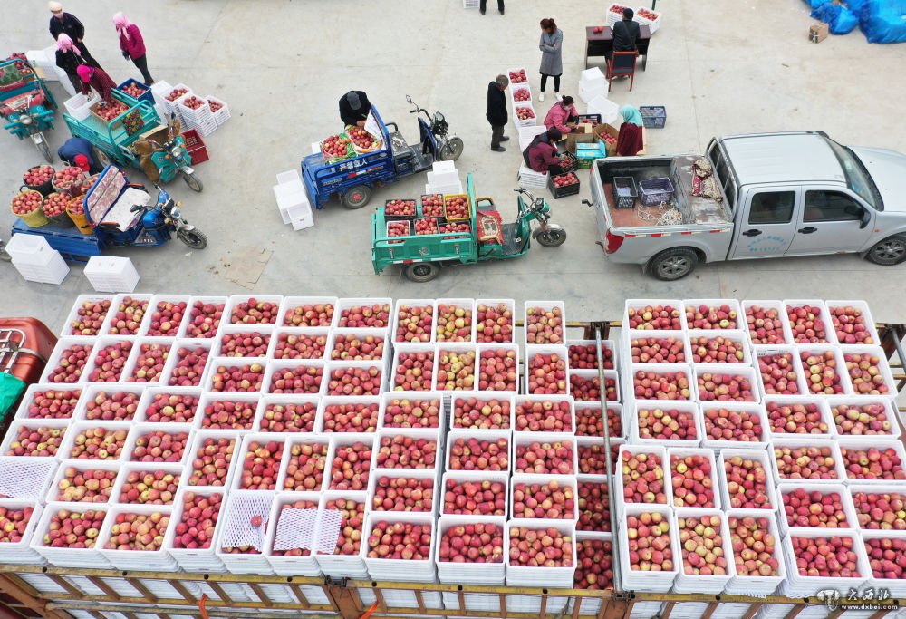 10月26日,果农在甘肃省临夏回族自治州永靖县岘塬镇果品合作社里交售苹果(无人机照片)。新华社发(史有东摄)