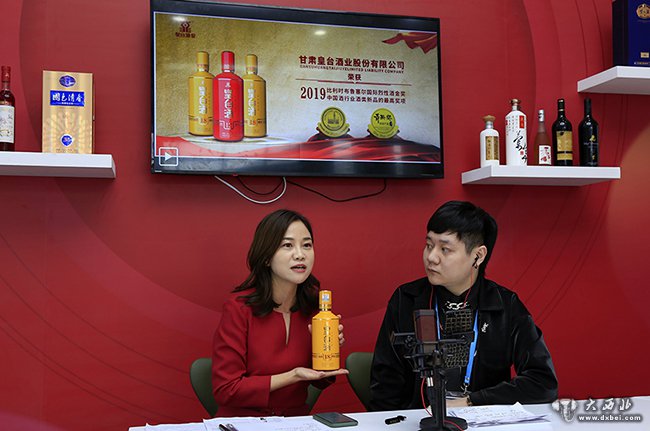 皇台酒业代表赵敏在酒博会直播间为线上观众介绍皇台酒。 贾笑云 摄