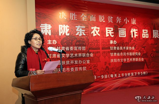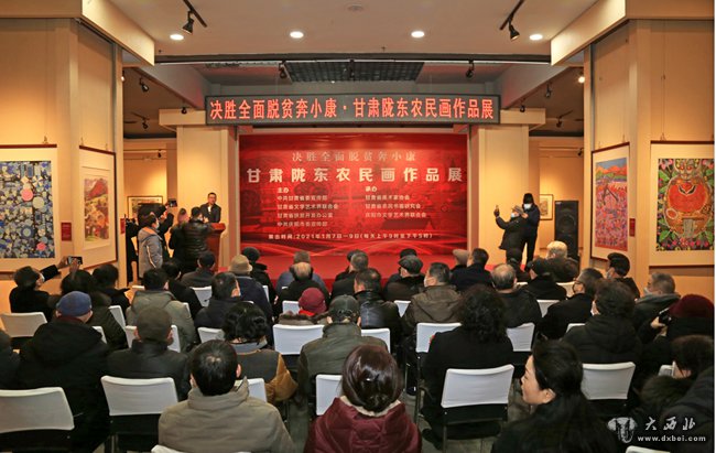 大西北网讯  2020年1月7日上午,由中共甘肃省委宣传部、甘肃省文学艺术界联合会、甘肃省扶贫开发办公室、中共庆阳市委宣传部主办;甘肃省美术家协会、甘肃省农民书画研究会和庆阳市文学艺术联合会承办的“决胜全面脱贫奔小康——甘肃陇东农民画作品展”在甘肃艺术馆开展。甘肃省文学艺术联合会、甘肃省扶贫开发办公室领导及书画艺术界约120人出席开幕式。甘肃省人大常委会原副主任程有清宣布开展。