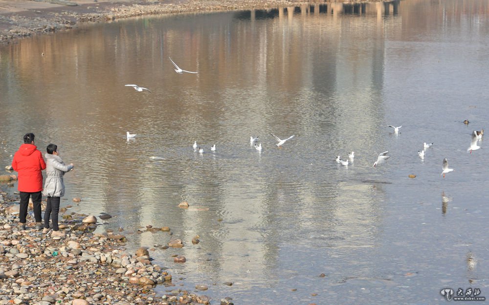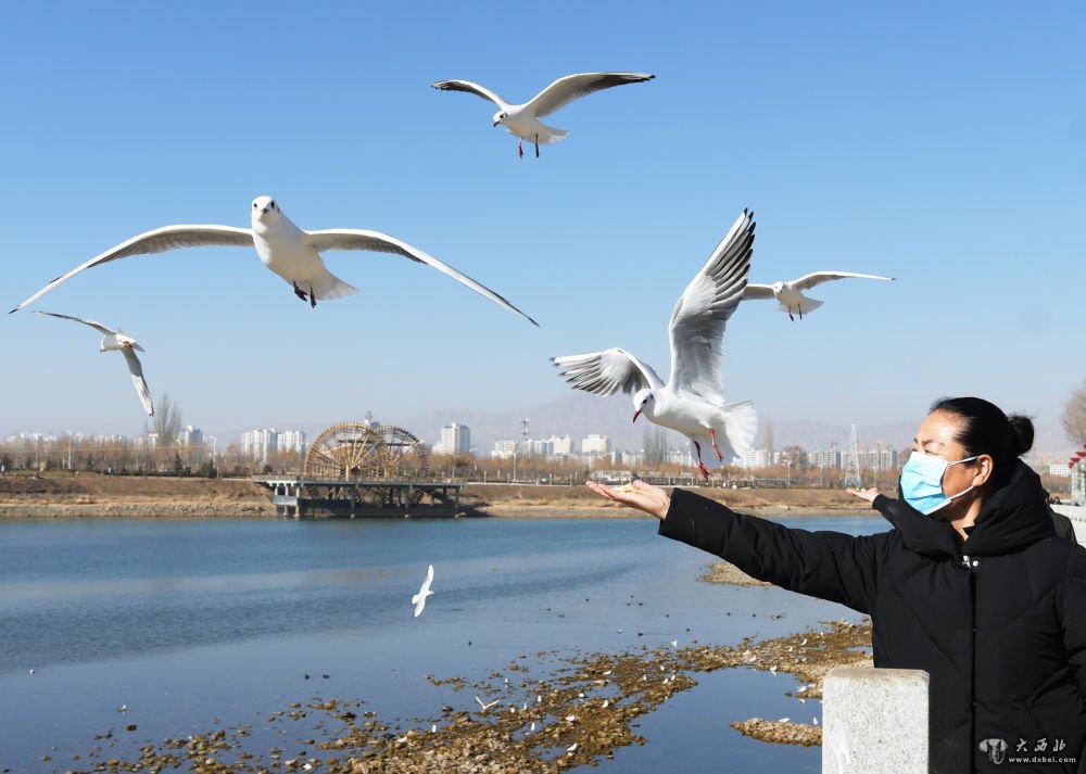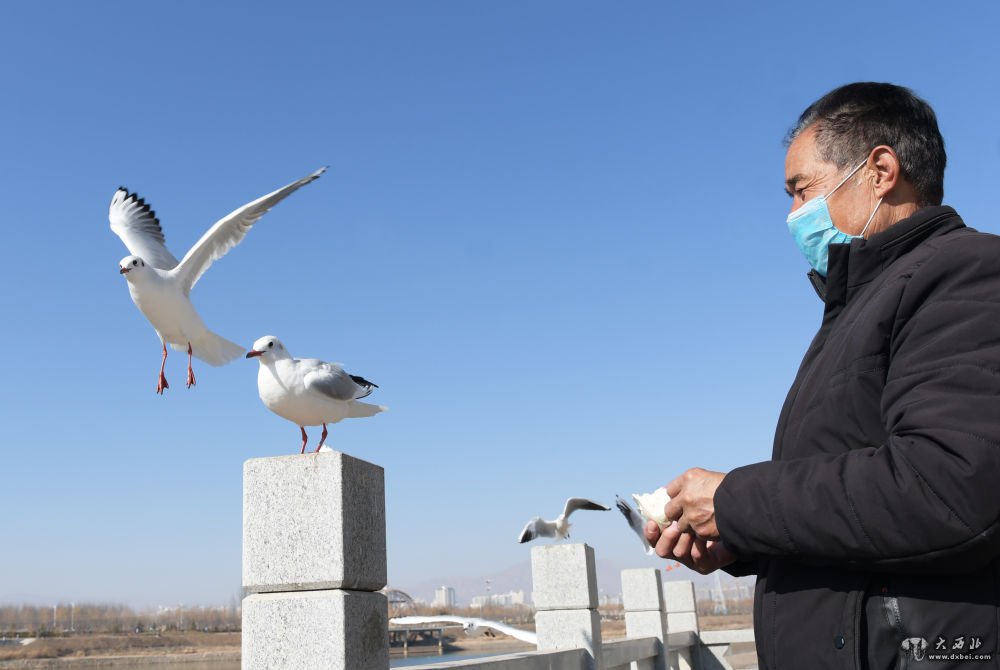 1月17日,在甘肃省临夏回族自治州永靖县刘家峡镇,居民给红嘴鸥喂食。新华社发(史有东摄)