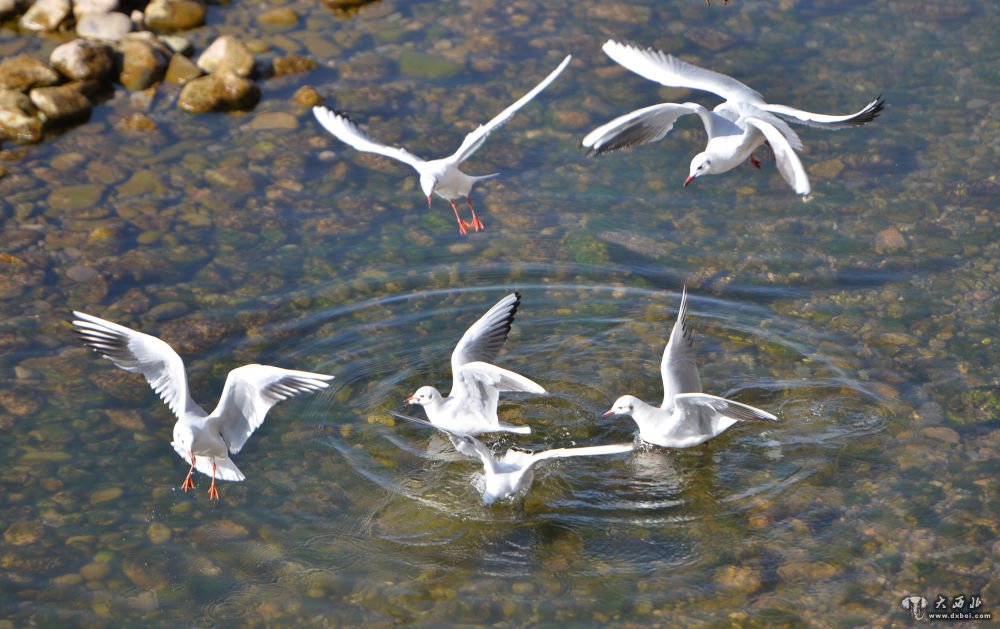1月18日,在甘肃省临夏回族自治州永靖县刘家峡镇,红嘴鸥在水面上飞翔。新华社发(史有东摄)