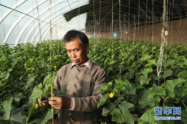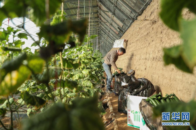 2月4日,在靖远县北湾镇新坪村,村民徐彦龙在大棚内管护黄瓜。新华社记者 马希平 摄