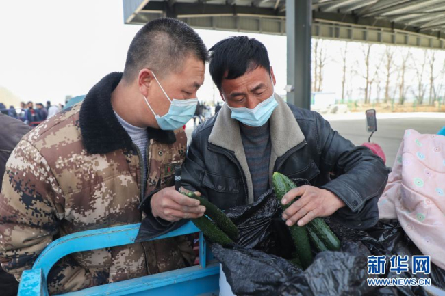 2月4日,在靖远县北湾镇新坪村农贸市场,菜贩胡荣辉(右)查看菜农种植的黄瓜。新华社记者 马希平 摄