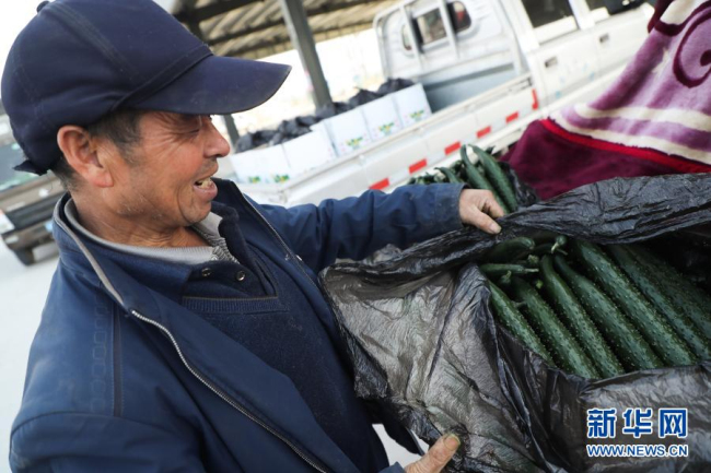 2月4日,在靖远县北湾镇新坪村农贸市场,村民展示刚采摘的黄瓜。新华社记者 马希平 摄