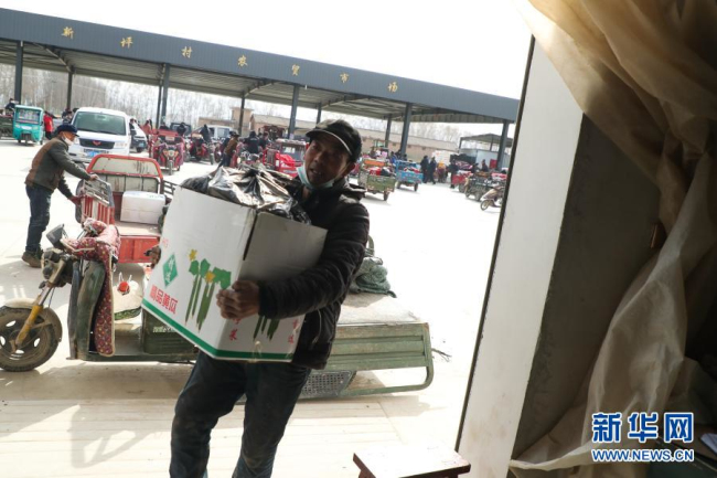 2月4日,在靖远县北湾镇新坪村农贸市场,菜农在搬运黄瓜。新华社记者 马希平 摄