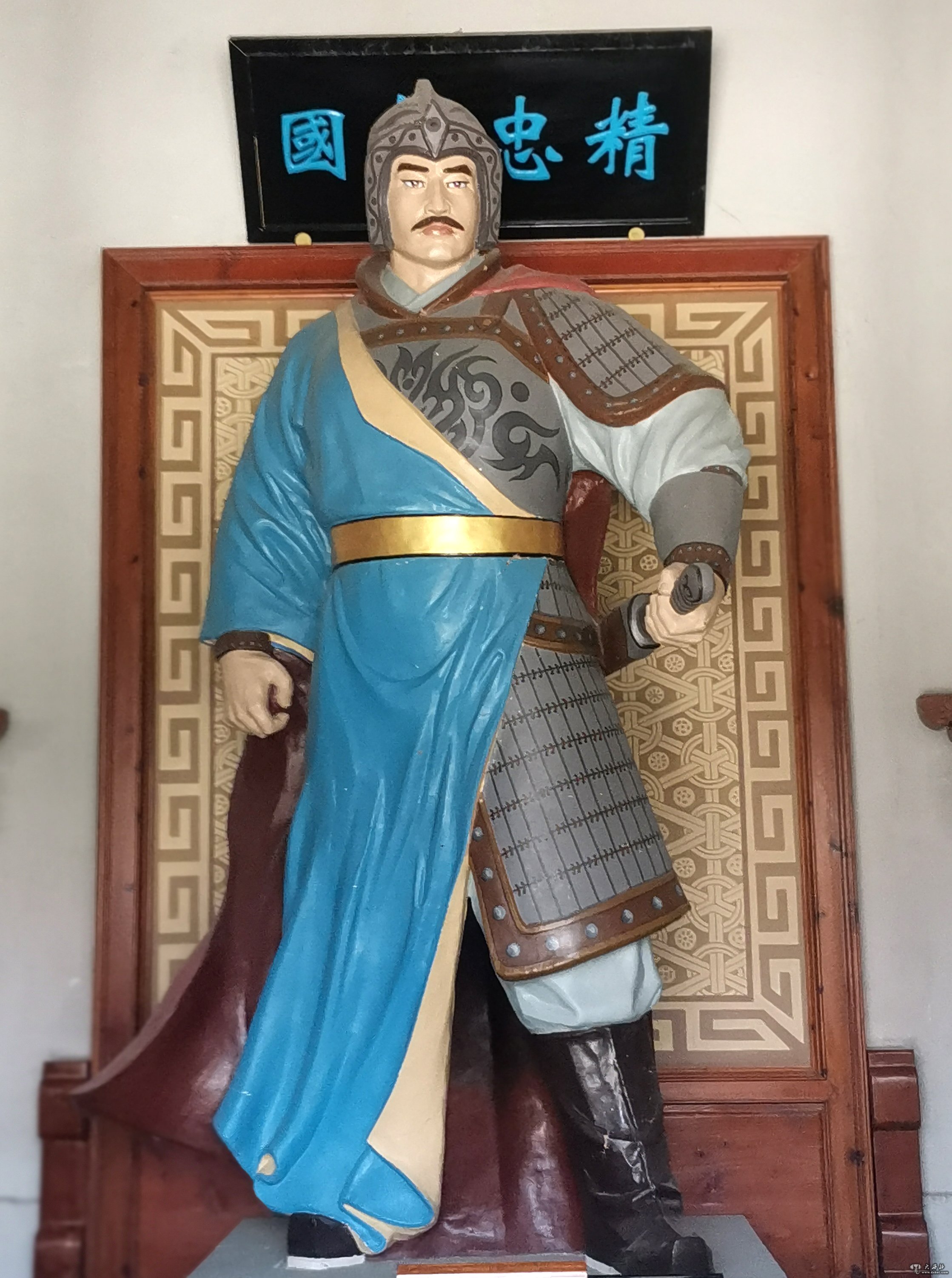 岳飞殿坐落在五泉公园半山中的清虚府内,清虚府是一座四方形的宽敞大院落,府内四面都有殿房。其中岳飞殿坐落府内南侧,东西两侧分别是左宗棠殿和杨忠愍殿。北侧殿原是外宾接待室,现已改为兰州国画研究院展室。岳王殿雕梁画栋飞檐翘角,外观宏伟,大气庄严。殿门中央悬挂着刻有“岳王殿”三个苍劲有力大字的牌匾。殿内正中是岳飞高大的塑像,塑像气宇轩昂,左手按剑右手紧握。他身着盔甲外披蓝色战袍威风凛凛,两眼炯炯有神凝视着前方。彼时我仿佛听到岳飞“还我河山”的呐喊回声。塑像后面是一块屏风,正中墙上是精忠报国牌匾。塑像左右两侧是书法抄写的《满江红》。东侧墙上是《岳母刺字》的大幅画像,西侧墙上则是岳飞带领岳家军浴血奋战的画面。