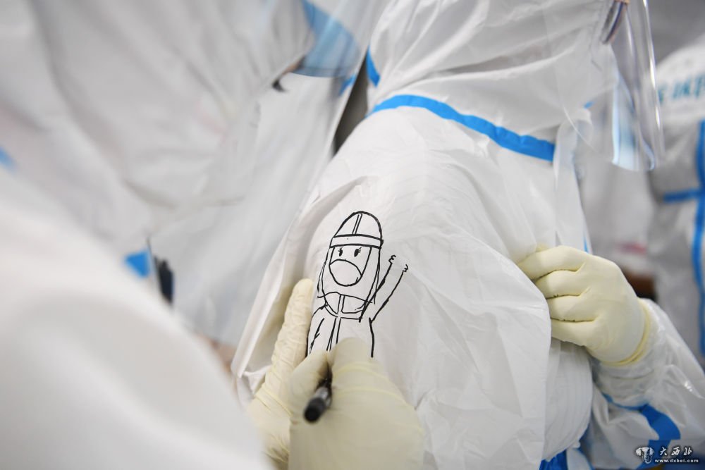 10月24日,“猎鹰号”硬气膜实验室工作人员普臣惠(左)给同伴的防护服上画上卡通图案,为同伴加油鼓劲。新华社记者陈斌摄