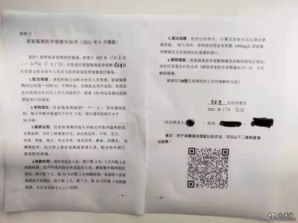 救护车驾驶室有两个人,一个是司机一个是社区网格员,他们要将我一直送到楼道单元口。考虑到担心引起邻居恐慌心理,我让救护车停在小区门口。然后做好防护由网格员陪同一起走回家中。在上小区单元楼梯时,我发现公告栏张贴有风险管控区的通知,旁边还有一张告知书上面写着:本单元有人居家隔离。我猜意思是要让邻居监督居家隔离人,让其老老实实呆在家里隔离。网格员走进我家后,拿出一份居家隔离告知书让签字,然后张贴在我家门口,又在防盗门上安装了门禁,这样可以远程随时随时观察我的动静。临走时网络员又交代了一些注意事项,并告知我明天还有人上门做做核酸检测,直到所有事情告知完毕后网格员才离开我家。虽然内心对网络员的个别做法感到不爽,但转念一想这既是对我负责,也是对邻居和社会负责心里也就坦然了。