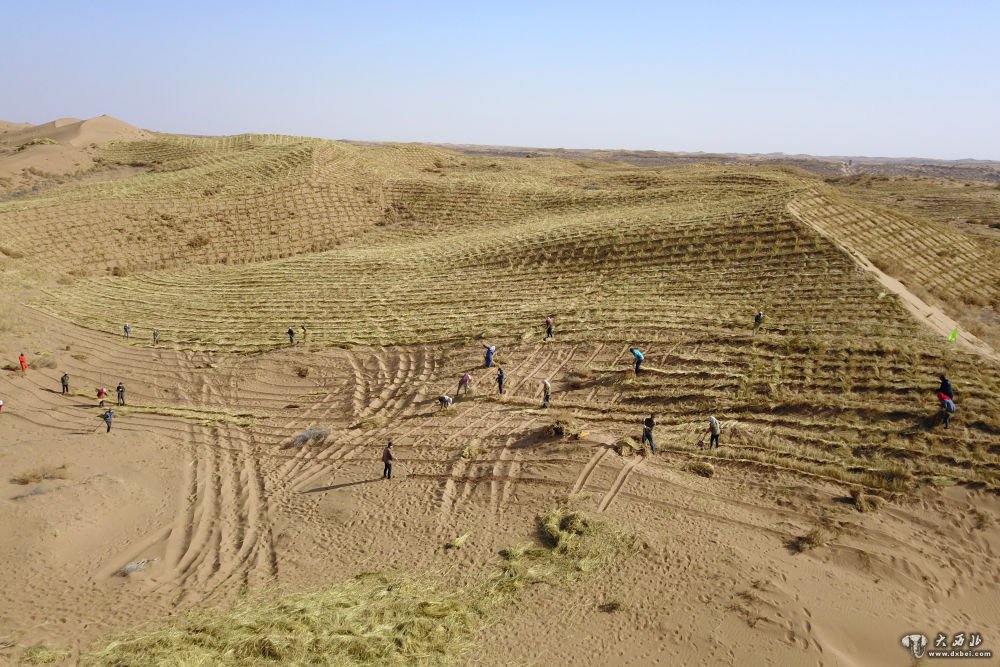 2020年3月6日,在古浪县北部沙区旱麻岗治沙点,八步沙林场治沙人扎草方格压沙(无人机照片)。新华社记者范培珅摄