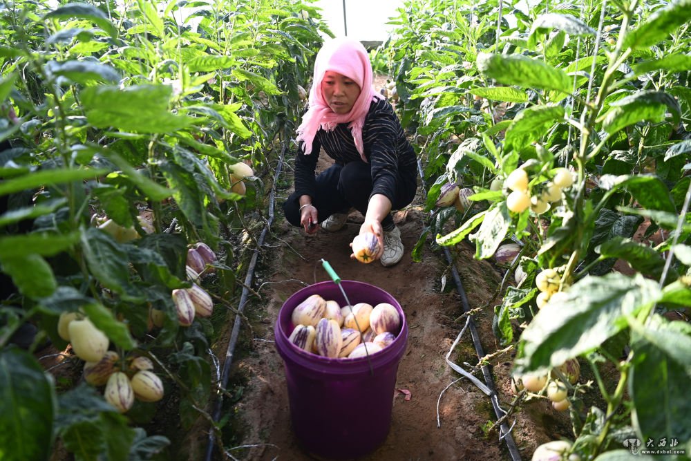 1月13日,村民在古浪县黄花滩生态移民区富民新村日光温室大棚内采摘人参果。新华社记者范培珅摄
