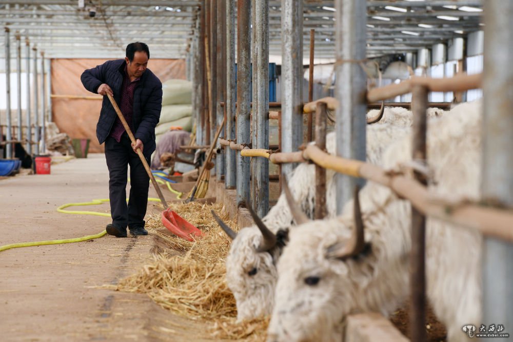 1月13日,村民在古浪县黄花滩生态移民区富民新村养殖暖棚给白牦牛喂食。新华社记者范培珅摄