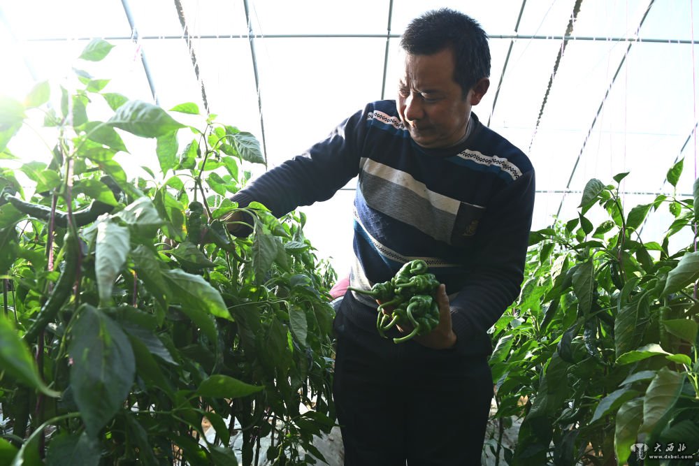 1月13日,村民在古浪县黄花滩生态移民区富民新村日光温室大棚内采摘辣椒。新华社记者范培珅摄