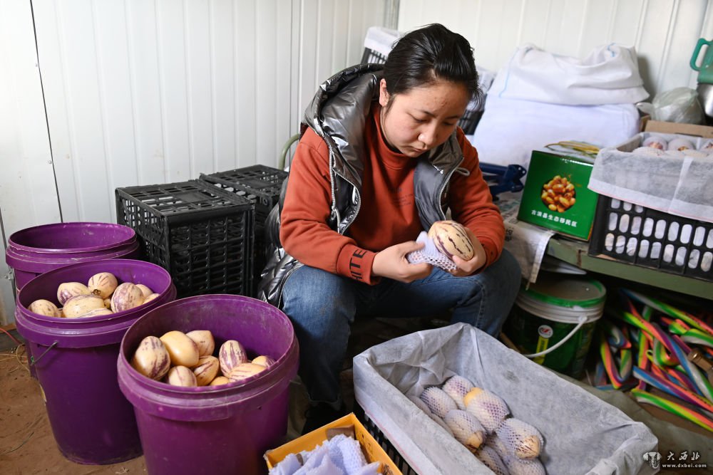 1月13日,古浪县黄花滩生态移民区富民新村村民包装采摘的人参果。新华社记者范培珅摄