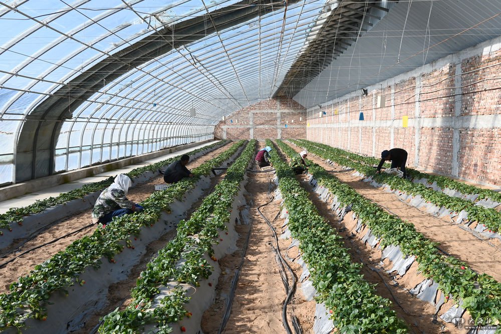 1月13日,古浪县黄花滩生态移民区富民新村村民在草莓棚中劳作。新华社记者范培珅摄