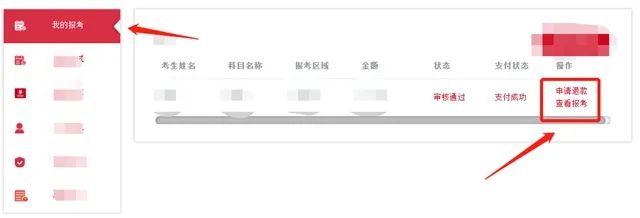 2、考生登录后进入“我的报考”菜单,点击“申请退款”后,根据系统提示选择报考的所有科目,完成申请退款全流程操作。
