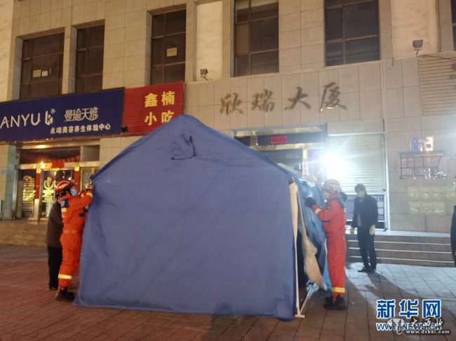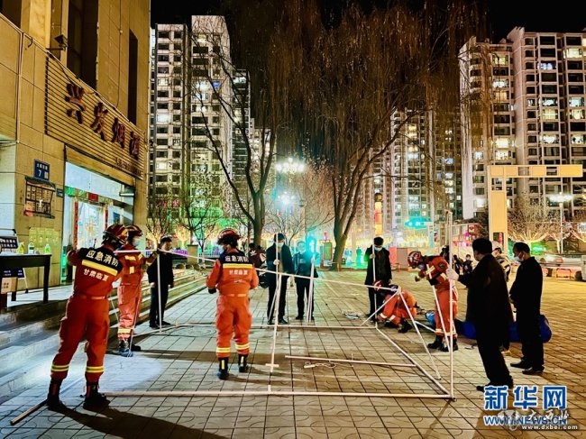 消防救援人员协助协助当地政府搭建防疫帐篷。