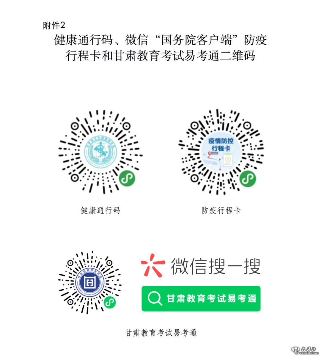 3.考前17天起,考生本人每天均须登录“甘肃教育考试易考通”微信小程序(扫码方式见附件2)进行健康打卡,健康打卡时会通过人脸及身份证识别方式对考生身份进行验证,并自动获取考生所处地理位置以检测考生是否在甘肃省内,考生要针对健康打卡提前做好准备。考生不得提供身体健康状况虚假信息,对隐瞒行程、隐瞒病情、故意压制症状、瞒报漏报健康状况的考生及所在学校追究相应责任。考前3天,省教育考试院根据考生在“甘肃教育考试易考通”的健康打卡情况,分析考生的健康状况,形成打卡结论。考前17天起每天连续成功打卡且健康码一直为绿色的考生视为“打卡合格”,否则视为“打卡不合格”,打卡结论以短信形式通知考生。