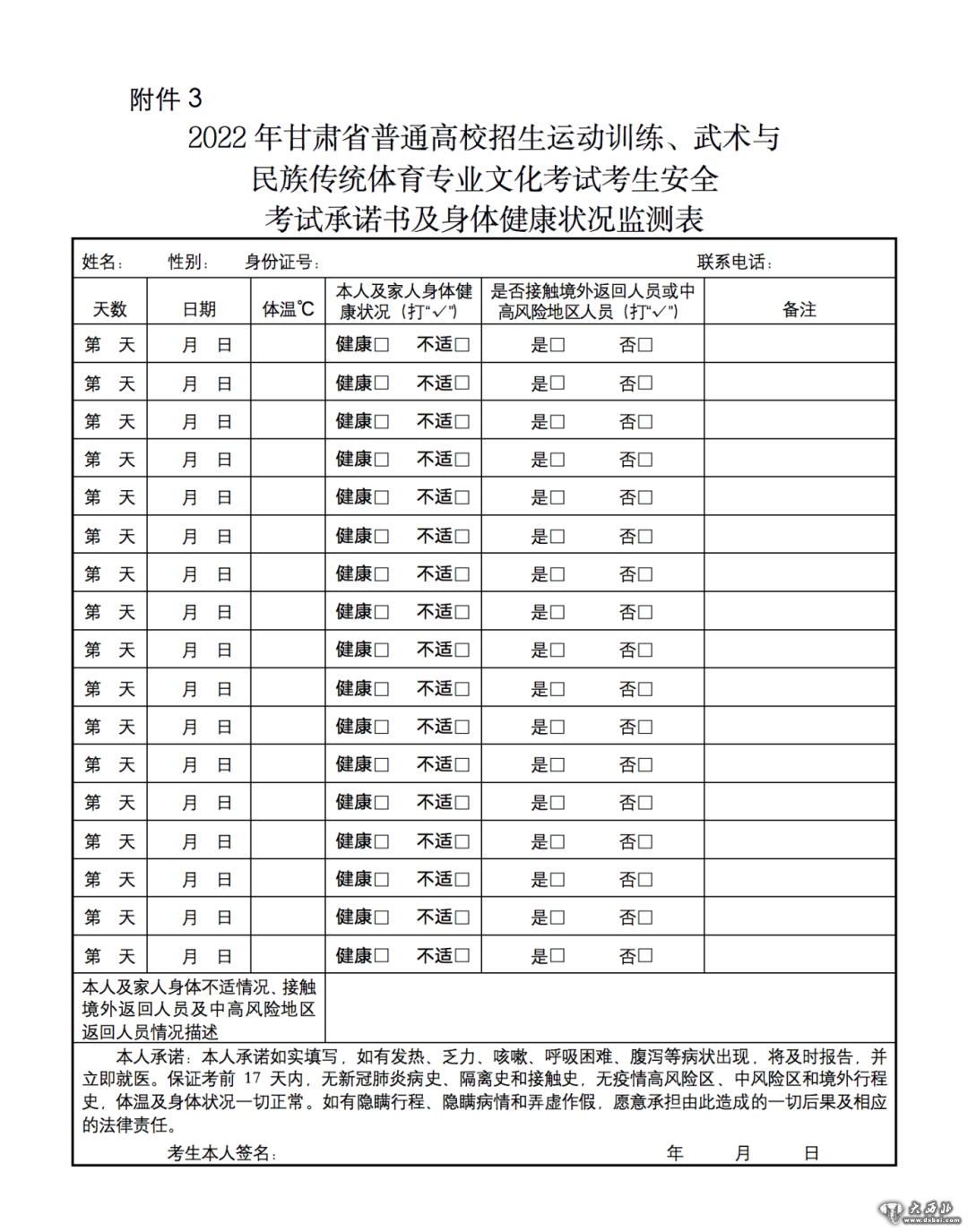 4.打卡合格的考生需持《2022年甘肃省普通高校招生体育艺术类专业准考证》《身份证》《2022年运动训练、武术与民族传统体育文化考试准考证》和考前3天内2次新冠肺炎核酸检测阴性证明参加考试;打卡不合格的考生须持《2022年甘肃省普通高校招生运动训练、武术与民族传统体育专业文化课考试考生安全考试承诺书及身体健康状况监测表》(见附件3)、《2022年甘肃省普通高校招生体育艺术类专业准考证》《身份证》《2022年运动训练、武术与民族传统体育文化考试准考证》和考前3天内2次新冠肺炎核酸检测阴性证明按相关要求参加考试。