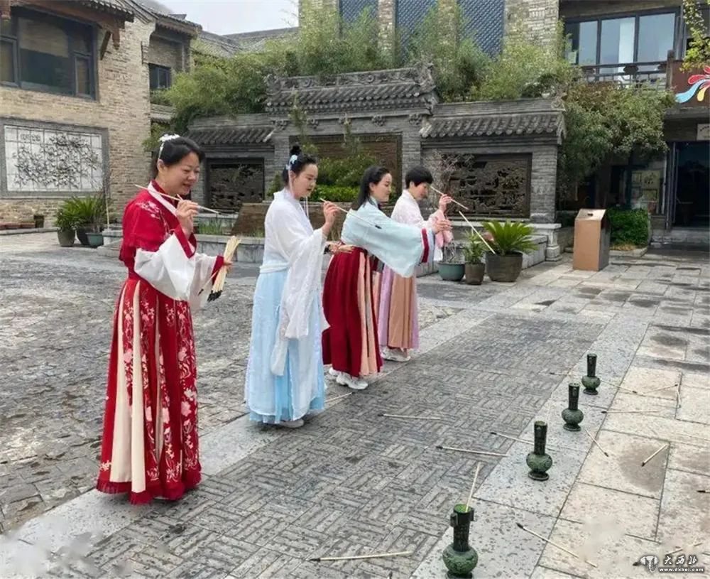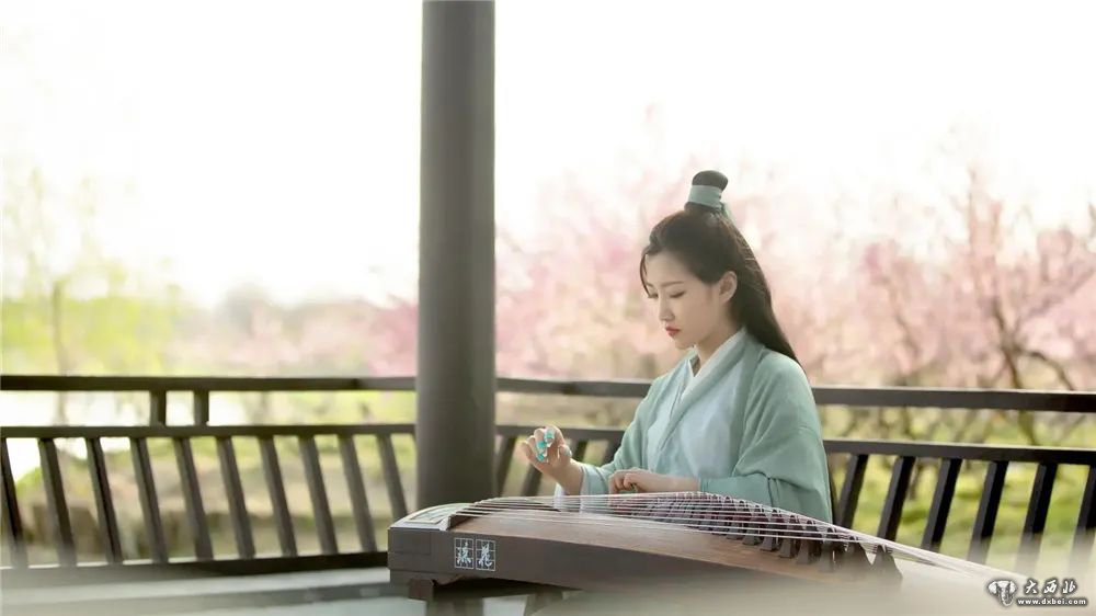 汉服才女在景区中台以古筝为奏,与游客互动,增加雅趣。