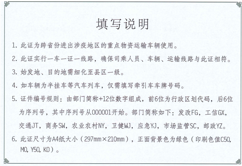 通行证是保障涉疫地区重点物资运输畅通的重要单证,由省新冠肺炎疫情联防联控机制监制,适用于我省为涉疫地区运送重点物资(医疗与防控物资、生活必需品、政府储备物资、邮政快递等民生物资和农业、能源、原材料、重点工业品等重要生产物资、重要进出口货物)运输保障。