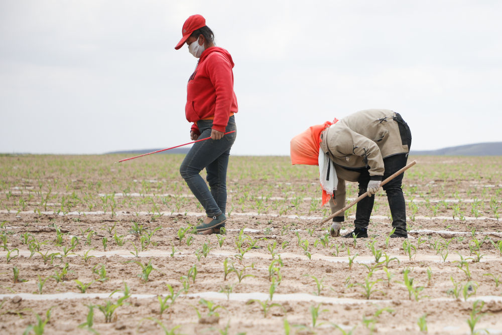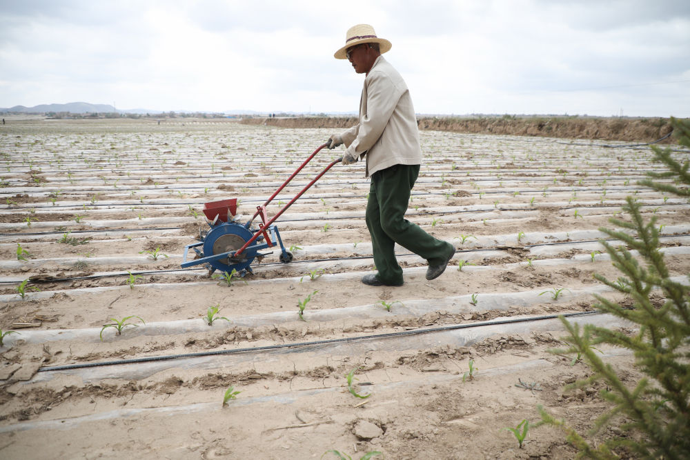 5月12日,在甘肃省白银市会宁县河畔镇李家塬村,村民在农田里劳作。新华社记者马希平摄