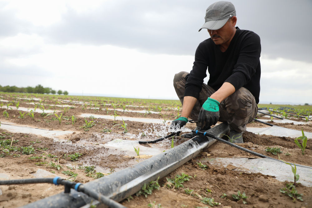5月12日,在甘肃省白银市会宁县河畔镇李家塬村,村民在农田里查看水肥一体化滴灌设施运行情况。新华社记者马希平摄