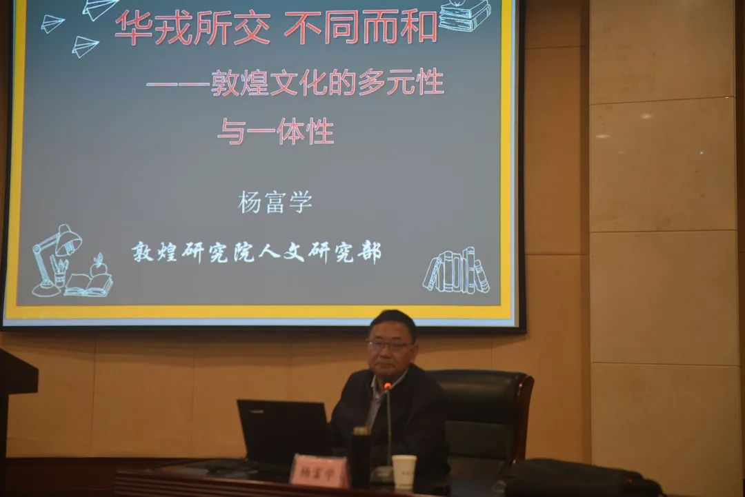 “敦煌文化古来即呈现出多元的特点,一方面表现为民族文化的多元性,同时又有外来文化的因素存在。不同文化融通发展,和谐相处,取长补短,最终形成具有中华文化特点的敦煌文化。多元文化通过共生而取得发展,最终实现了敦煌文化由多元性向一体化的演变。”当天讲座中,杨富学教授分享了敦煌文化形成与发展等知识。