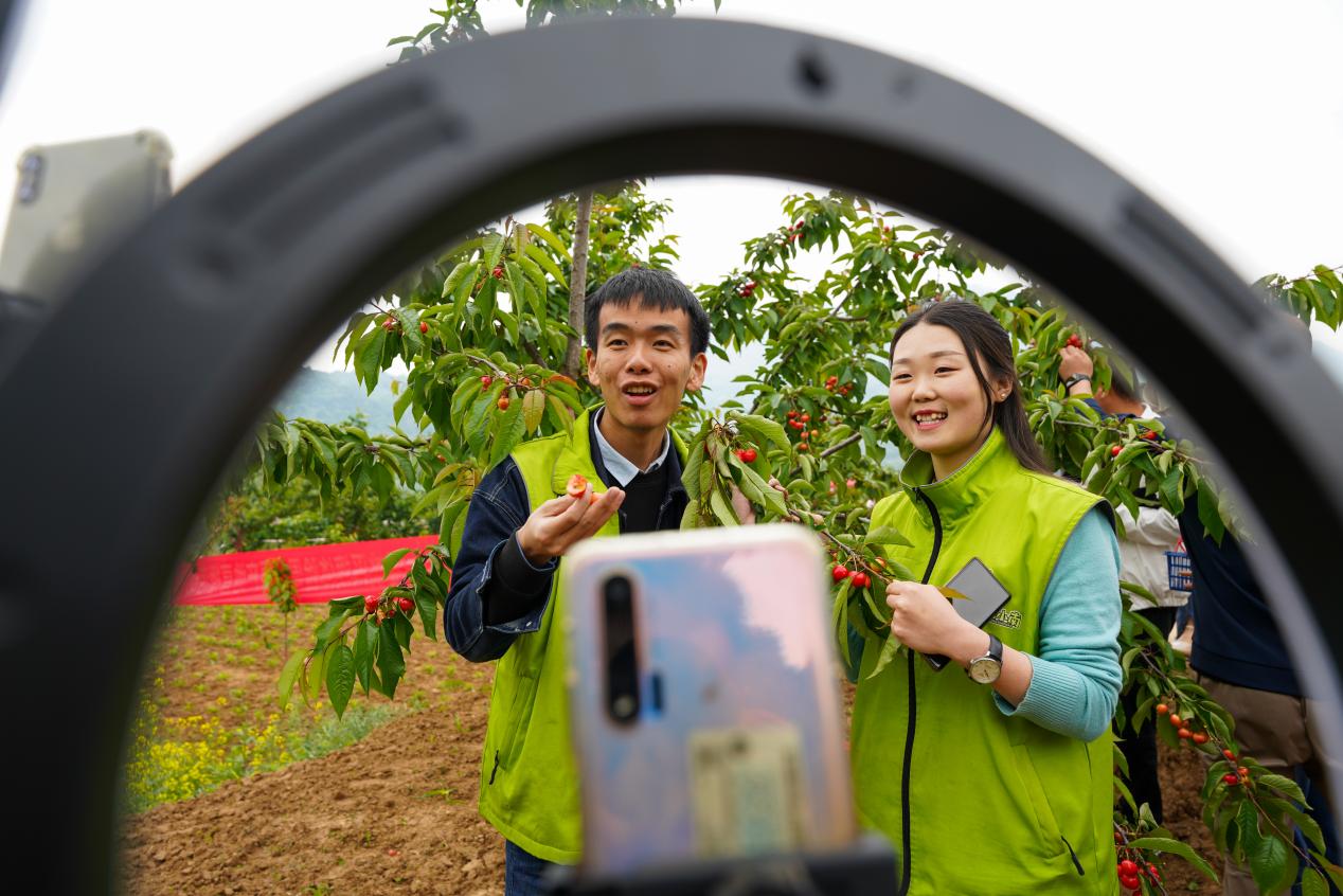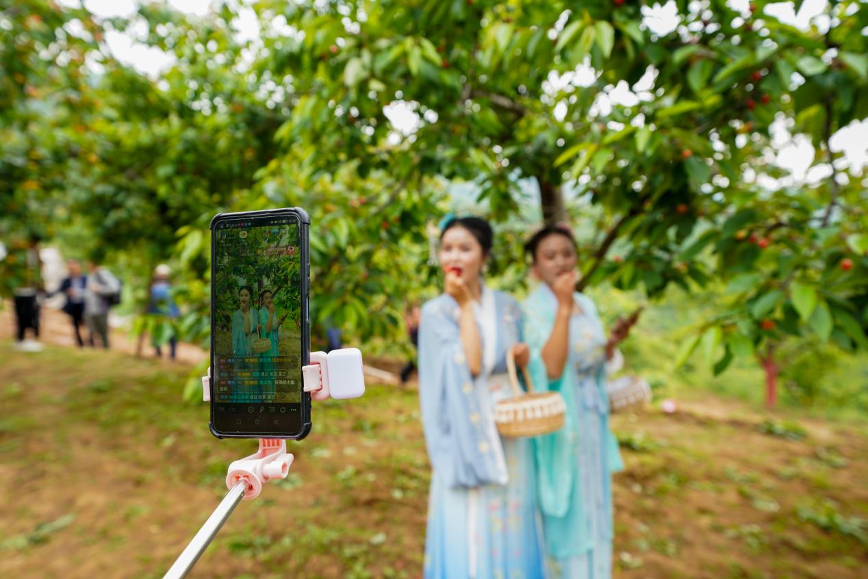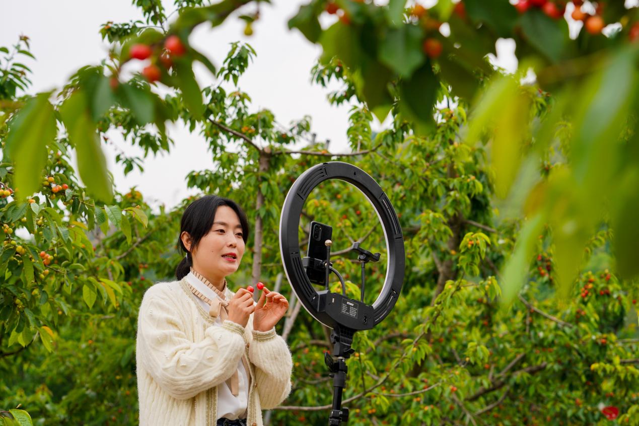 短视频爱好者在成县小川镇西狭村樱桃园拍摄、推介当地大樱桃,助力线上销售。