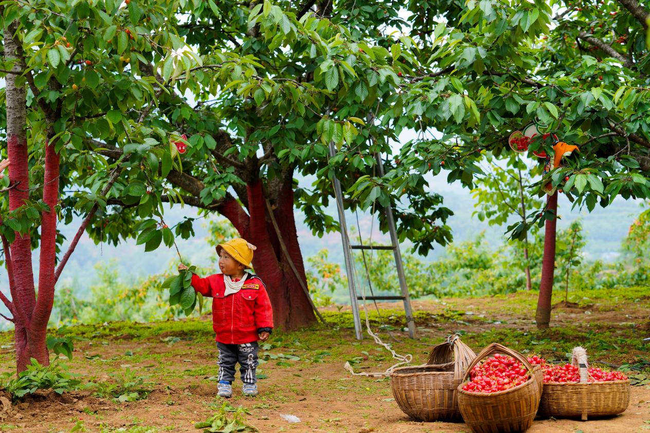 小朋友在成县小川镇西狭村樱桃园采摘大樱桃,体验采摘乐趣。