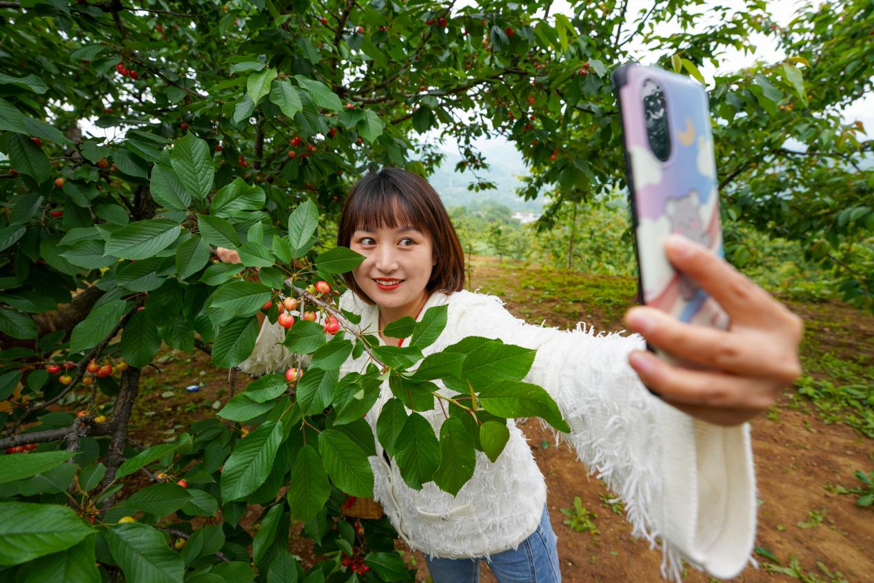 游客在成县西狭村樱桃园体验采摘樱桃、拍照留念。